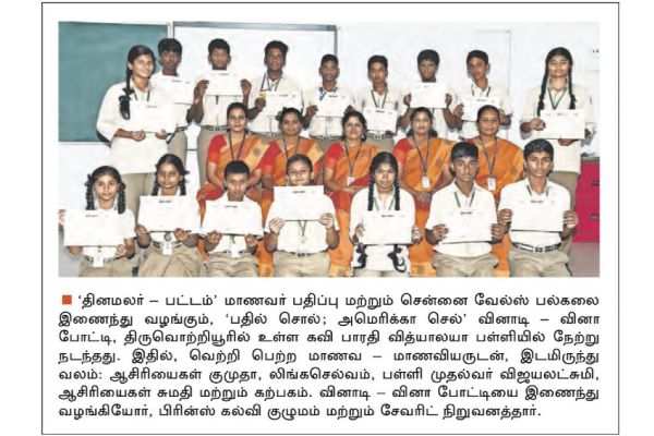 ‘தினமலர் – பட்டம்’ மாணவர் பதிப்பு மற்றும் சென்னை வேல்ஸ் பல்கலை இணைந்து வழங்கும். ‘பதில் சொல்; அமெரிக்கா செல்’ வினாடி வினா போட்டி, திருவொற்றியூரில் உள்ள கவி பாரதி வித்யாலயா பள்ளியில் (17/11/2022) எழுத்து தேர்வு மற்றும் வினாடி வினா நடந்தது. இதில், வெற்றி பெற்ற மாணவ மாணவியருடன், இடமிருந்து வலம்: ஆசிரியைகள் குமுதா, லிங்கசெல்வம், பள்ளி முதல்வர் விஜயலட்சுமி, ஆசிரியைகள் சுமதி மற்றும் கற்பகம்.