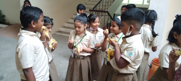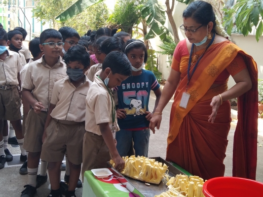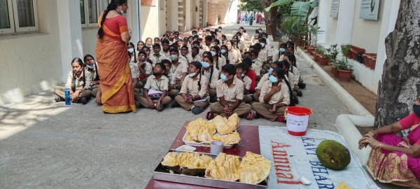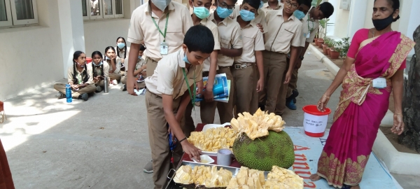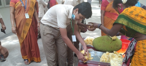 KBV celebrated ‘Jackfruit Day’ to raise awareness about the fruit and its versatility. Every year the school purchases jackfruits from Panruti: A Paradise for jackfruit. Even this year the fruit was purchased and distributed to students. To aggrandize the celebration, this year an astounding and euphonious song on ‘Jackfruit’ was composed by the Principal Mrs. Vijayalakshmi and teachers Mrs. Gayathri and Mrs. Mahalakshmi. Students in their mellifluous tone sang the song and relished the taste of the fruit. It was an experiential learning for them. They learned that the outside of the fruit is thorny and inside it is sweet. The seeds were also boiled/toasted and were given to all students.