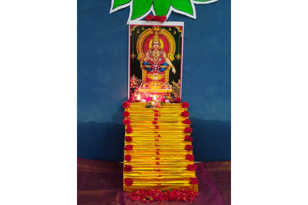 The programme began with the lighting of the Kuthuvilakku by the board members, the Principal, and the Headmistress. The stage decoration followed the theme of Lord Ayyappa, with 18 steps and clay diyas. Parents and students took part in lighting the diyas around the school.
