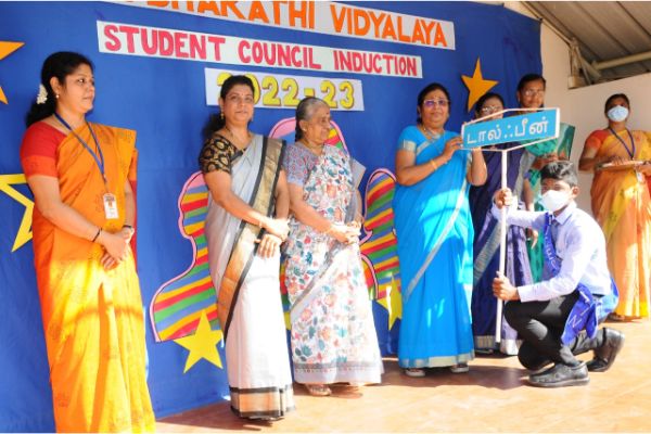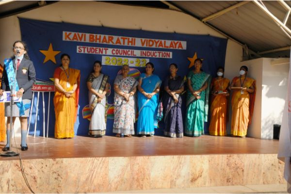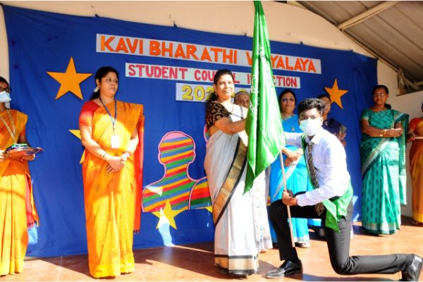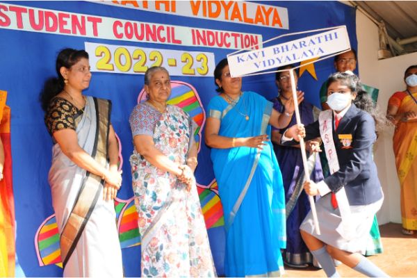 The Student Council Election for the academic year 2022-2023 was marshaled in Kavi Bharathi Vidyalaya on 15th June 2022.To promote a sense of personal responsibility among students, a two-day campaign was conducted on 18th and 19th April, 2022. Candidates from classes IX and X were nominated for the posts of SPL, ASPL, House Captains & Vice Captains. Charts were prepared, slogans were raised, badges were distributed by the nominees and they visited the classes to manifesto. The campaign ratified, valor and sanguine in them.On 20-04-2022, a democratic form of election was conducted. Polls were maintained; specifying the names of the respective houses. Students were brought grade wise to caste their votes and the voters received an impression on their forefinger to verify.The Student Council Election result was declared on 22nd April, 2022.To honour the designated leaders, the “Investiture Ceremony” was held on 15th June 2022. The Board Members Mrs. Krishnanveni Kalanithi, Mrs. Umadevi Kamaraj, Mrs. Kokila, Mrs. Renuka Devi, Mrs. Mala Thangaraj and Principal Mrs. Vijayalakshmi presided the function.marched forward with reverence to receive their House flags. The Board Members and the Principal Bedecked their chest with a badge and a swathe. Mrs. Kokila, respected Board Member, wished and blessed the Council leaders with her words of wisdom.